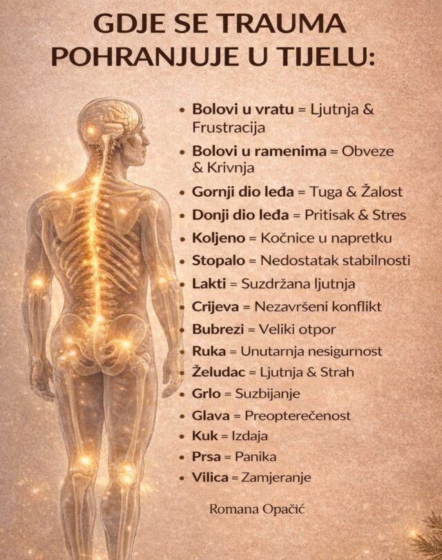 Ali ništa od toga ne nestaje samo od sebe. Sve što ne osjetimo do kraja, sve što ne priznamo sebi, ne gubi se – ostaje duboko zapisano u nama. Tijelo pamti više nego što mislimo. Pamti svaki strah koji smo progutali, svaku povredu koju smo umanjili, svako razočaranje koje smo prešutjeli. I onda, kada duša više ne može šutjeti, tijelo počinje govoriti. Govori kroz bol, kroz umor, kroz napetost, kroz bolesti koje nas tjeraju da stanemo i pogledamo u sebe.